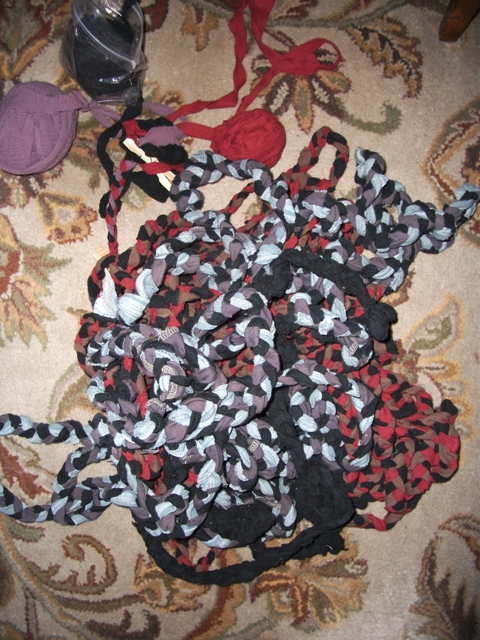 The t-shirt rag rug. I started this shortly after I moved into the house I moaned about in the first post, so that would make it around 6 years old, not too bad. I bought a giant crochet hook to make it and I told myself this was the excuse I needed to finally commit to learning how to crochet. I vaguely remember watching a few videos and starting it, but then I stopped…I think it was because I had cut up the shirts without any regard to keeping a uniform strip size, or else I just encountered my weird mental crochet block. So I started braiding the scraps. This was not an unfamiliar act for me – when I was around 10 or 12, I made a braided rag rug out of my mom’s old fabric and clothes scraps (including a 1960s era cotton paisley, and some suit wool) to rest on a brick dais of sorts where the wood stove was in our old house. I sat on that thing next to the stove nearly every day in the wintertime, then it became a favorite place of the dog’s as well. Needless to say, it was well-worn and probably thrown away when they sold the place. I had the intention of using my newly created t-shirt rug in my studio, but I ended up liking the bare floor since it was an easier surface on which to cut and smooth out materials. The shirts were all mine and mostly from the 1990s and early 00s and had become cropped from the dryer or had some other fault I couldn’t tolerate. And I have a vague memory of becoming annoyed with the balls getting twisted up while I was braiding them…but I quit the project about three years ago, though I think I may have gotten it out once in the meantime. Yesterday, I emptied out the box of rug snake: