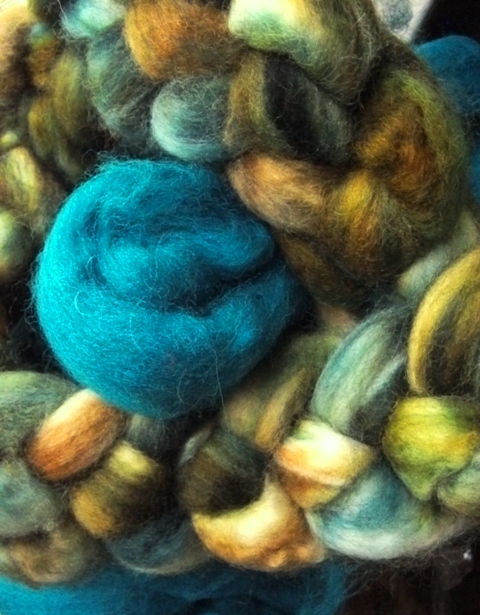 (I hesitate to mention that I also have some solid turquoise-ish** roving that could be blended or plied with it to stretch it further, but I could potentially screw it up.) But that does get me thinking… Spinning beautifully dyed wool always results in beautiful yarn, and in a way I feel a little bit like I’m cheating since I didn’t dye it myself. Sure everyone spins differently and the colors can really change depending on the technique, but it all ends up being uniform in its gorgeousness. So if I blend it with another color, my potentially f*cked-up skeins would at least be unique and more of a I’ll-do-it-by-myself-thankyouverymuch along… hmm…