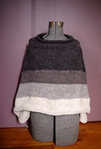 So I almost finished it in a week, then unknit the cast-off I began on Thursday, ignored it on Friday, tried it on on Saturday, deemed it a very good cozy thing, finished un-knitting it – took it up another row or two (I didn’t keep track, damn me) so I’d have another row of garter, and started a few stitches of garter to remind myself it should be smooth sailing from here on out and maybe I could finish by the end of the weekend?