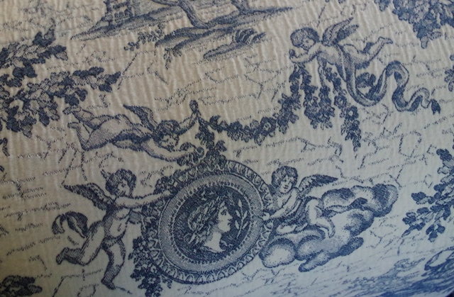 Some of these are are a little earlier too, and I remember the top blue covering a chair seat likely done in the ’60s… and I vaguely recall the black or navy used for a piece of clothing for me. A bit more of this sort of calico found its way into the treetop of this piece.