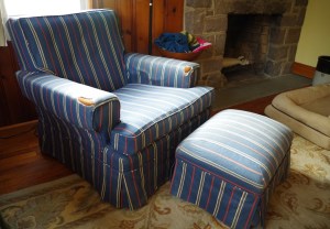 It is where I knit and sew by hand (usually while watching TV), read, and occasionally nap. It’s the one piece of furniture that the dog isn’t allowed on (though he doesn’t always agree), and I feel I have a right to boot the other household member off (it’s also the spot with the brightest light in the room).