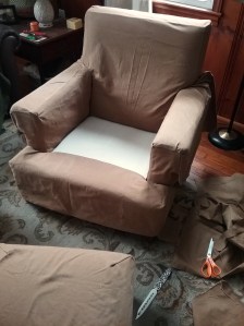 Somehow I got through it – start to finish on a weekend (probably 3-day weekend) – the hemming in place was probably the worst part and shredded my fingers and back ligaments. There was a moment of staple gunning on the side panels, but it had no purchase, so a few pieces got sewn to the chair, and it fails as a removable, washable slipcover.