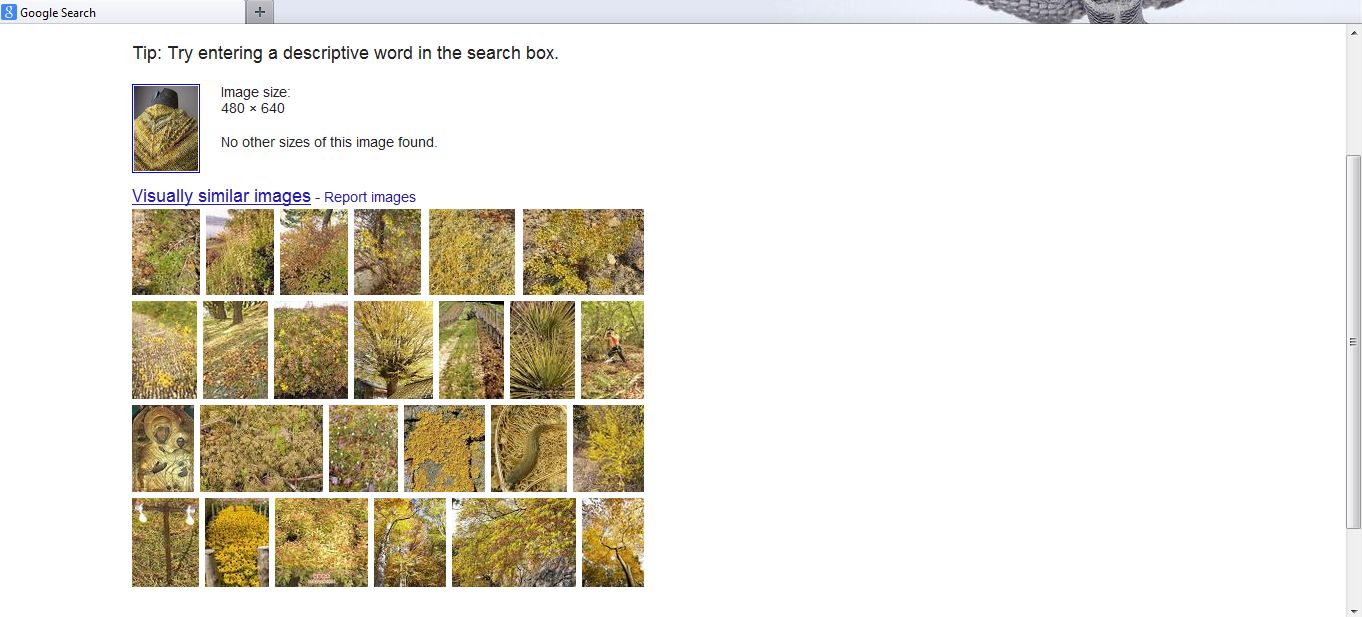 What you can’t quite see is my picture of a grey cowl matching images of owls in tree bark, cathedrals, shaggy dogs, rocks, chandeliers, and even a few other faces and knitted items. All of the matches relate to color, texture, and shapes in my image.